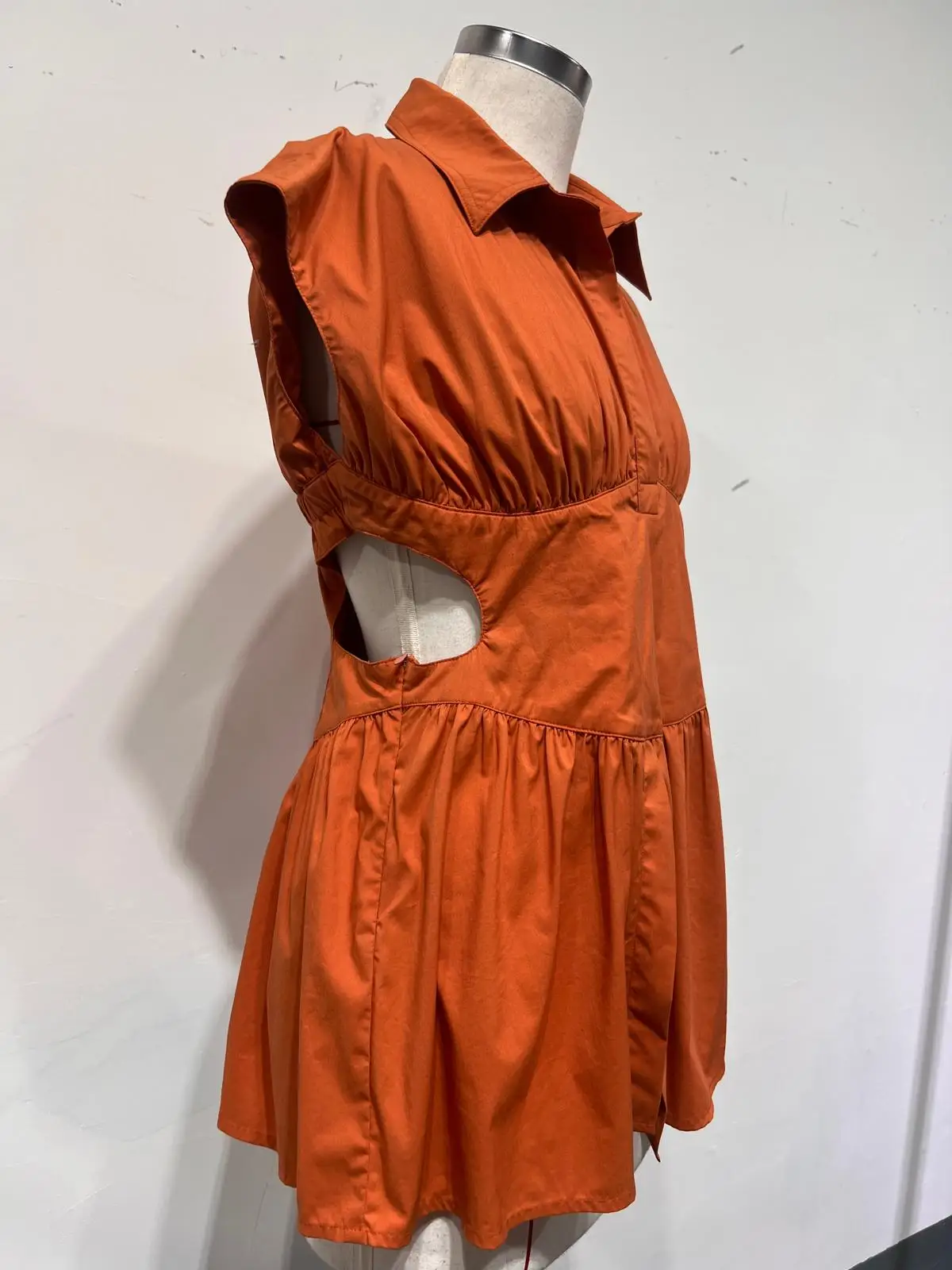 * 特色:锈橙色、无袖、领口、侧面镂空、褶饰紧身胸衣、裙子、高腰、迷你长度、无弹力、可机洗(建议冷水洗涤)