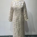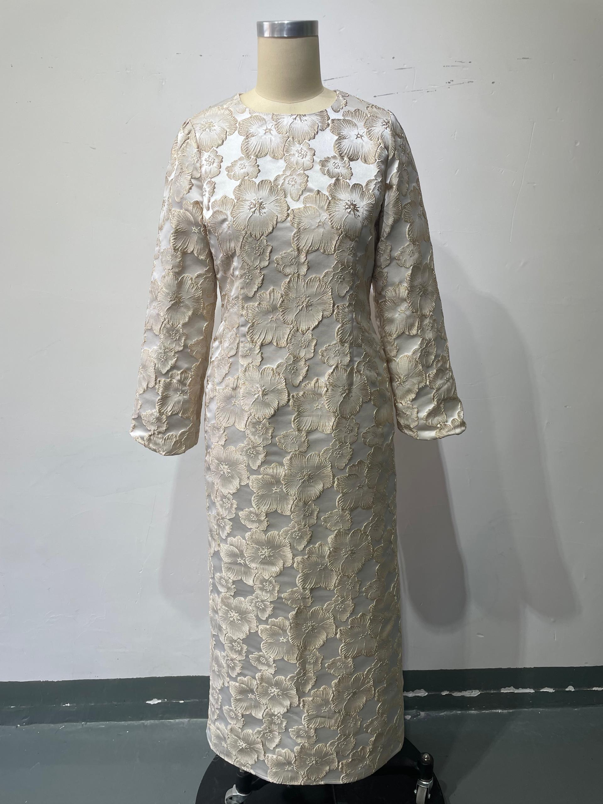 Designed with a classic round neckline and long sleeves, this midi-length dress offers a graceful, modest silhouette. The clean lines and all-over floral texture make it suitable for formal occasions or as part of a custom fashion collection. Understated yet refined, it’s a beautiful blend of craftsmanship and elegance.