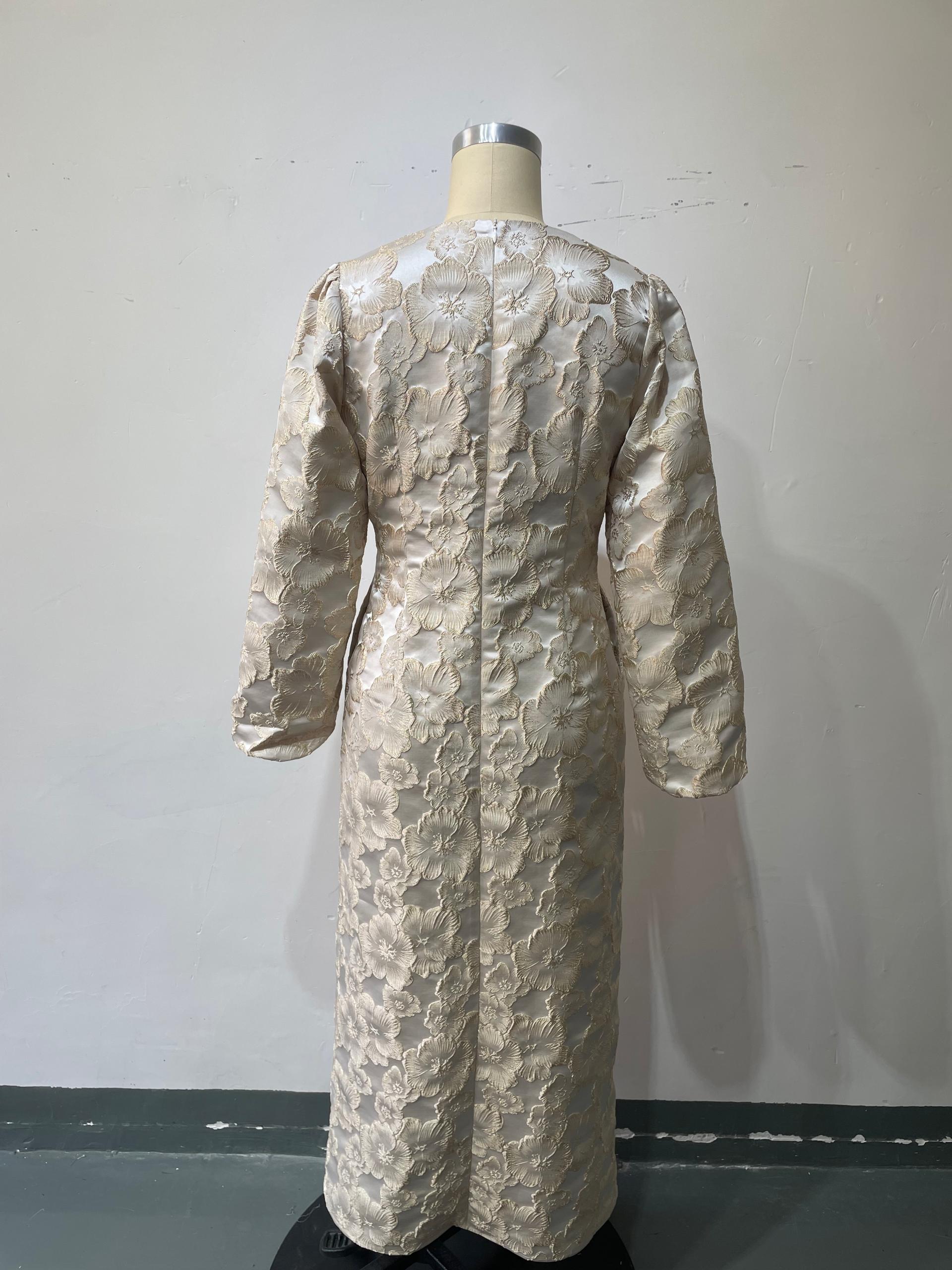 Crafted from premium jacquard fabric, this dress features woven floral patterns directly integrated into the textile. The fabric is structured with a subtle luster, offering a rich and dimensional texture.