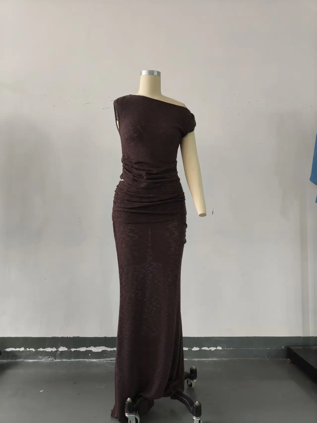 This off – shoulder maxi dress is a perfect combination of elegance and style. The rich brown color exudes a sense of sophistication, while the off – shoulder design adds a touch of allure. The ruched detailing on the body creates a flattering silhouette, hugging your curves in all the right places. Made from high – quality fabric, it offers a comfortable fit and drapes beautifully, ensuring you look and feel great at any occasion.