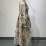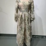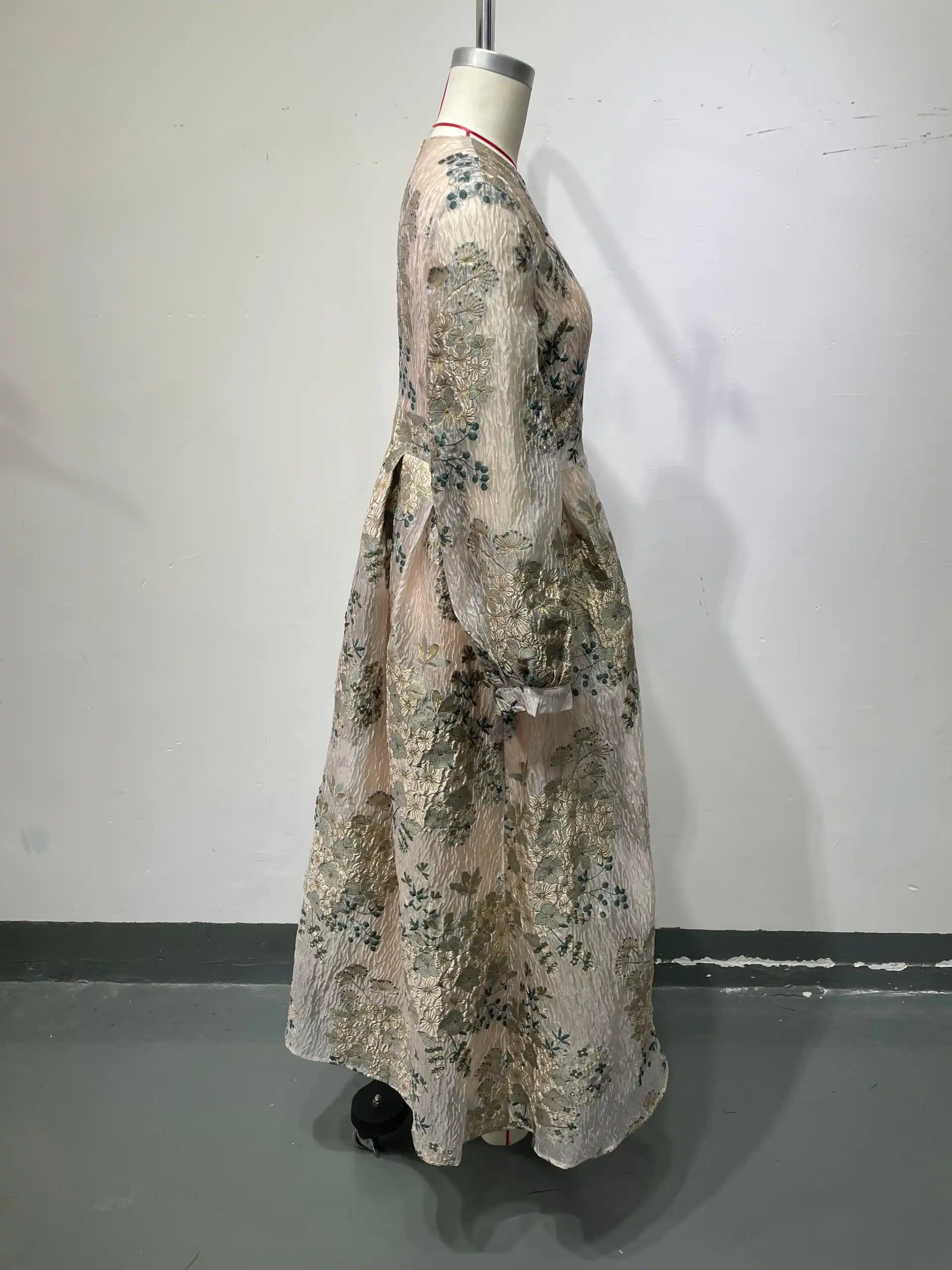 This dress is made from high-quality jacquard fabric, where the intricate floral patterns are woven directly into the fabric during the weaving process  The result is a richly textured surface that feels both luxurious and structured.