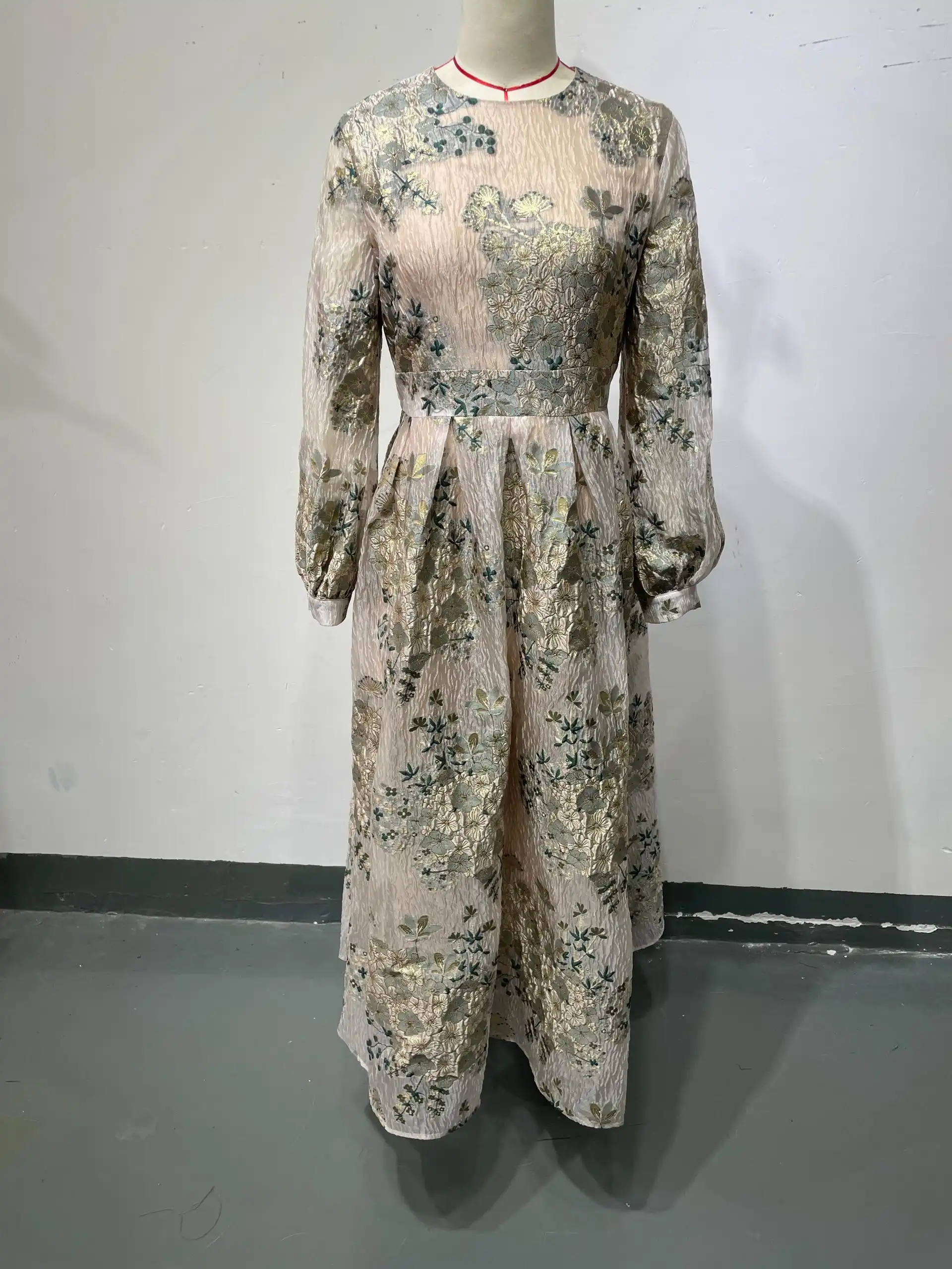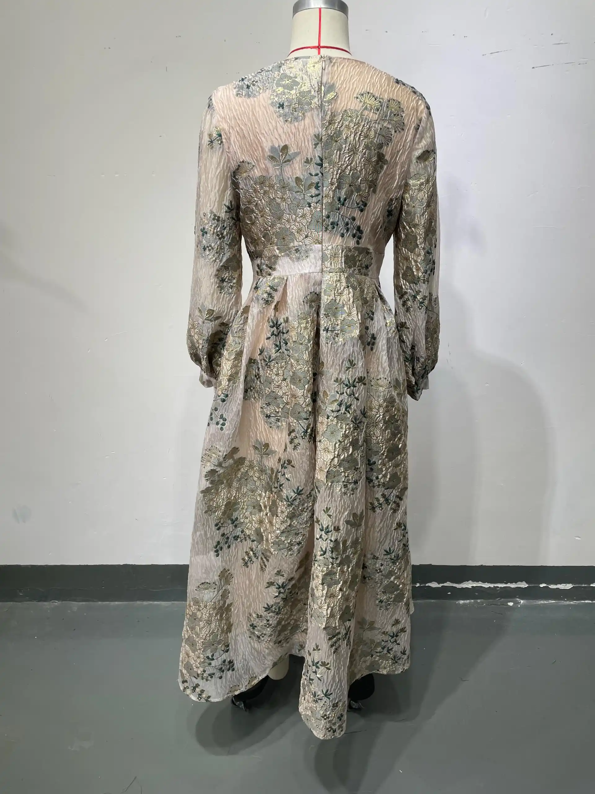 This dress is crafted from rich jacquard fabric, showcasing a textured finish with intricate floral motifs woven in shimmering metallic threads. The fabric lends a luxurious structure and a refined sheen, enhancing its sophisticated appeal.