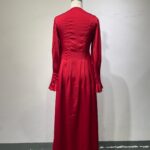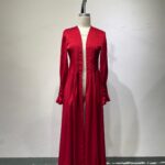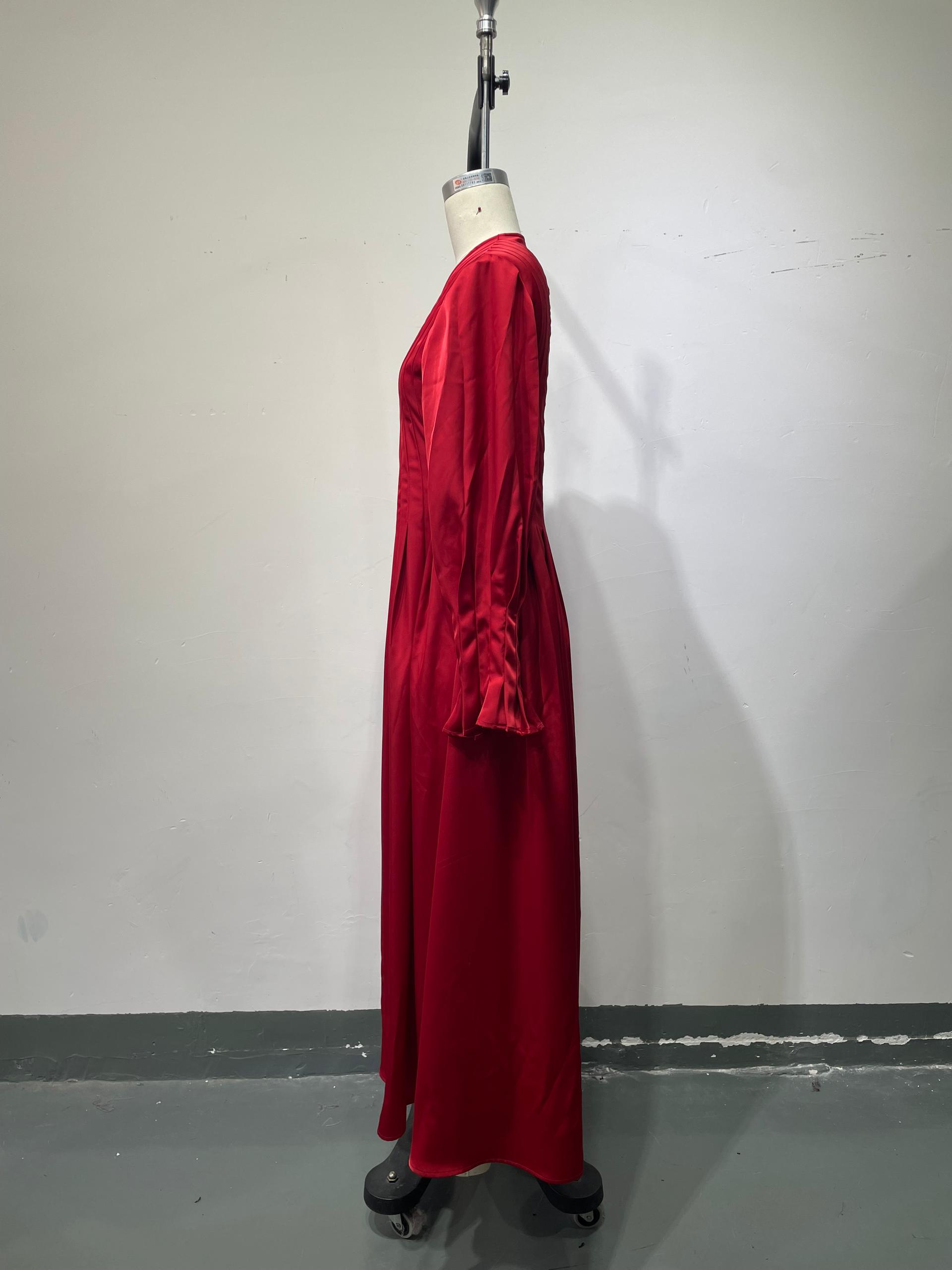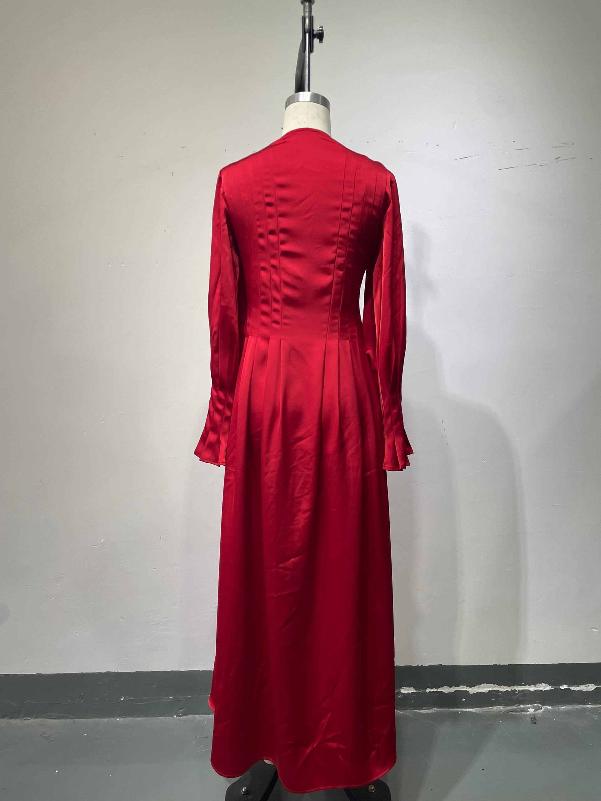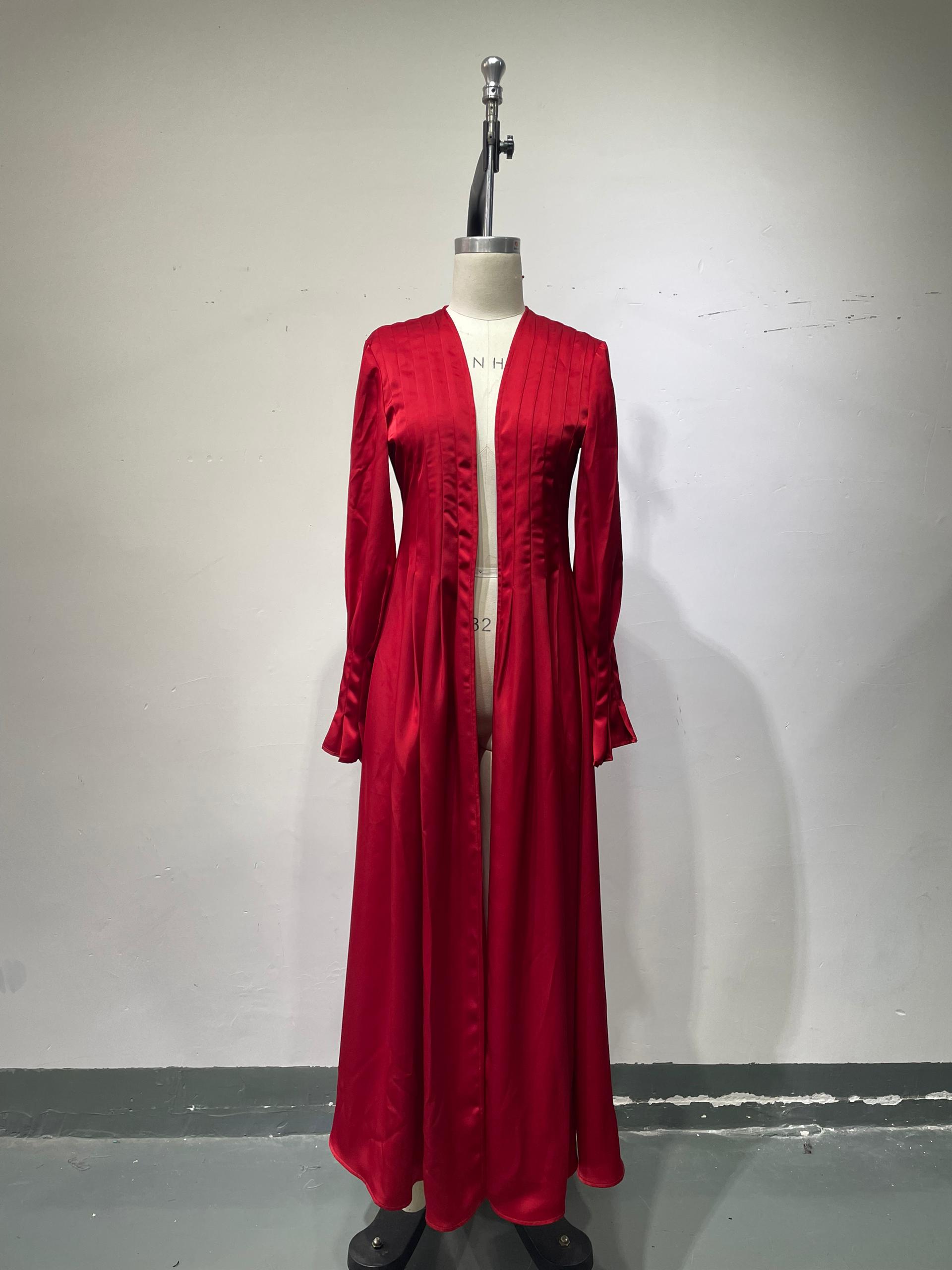 Crafted from luxurious satin fabric, this vibrant red long dress is designed to make a statement. The smooth, lustrous surface of the satin brings a rich sheen and fluid drape, elevating the overall elegance of the garment. Featuring fine vertical pleats along the bodice and flared long sleeves with delicate cuffs, the silhouette strikes a perfect balance between classic charm and modern refinement. The front-open design adds versatility, allowing it to be worn as a dress or a stylish overlay.