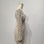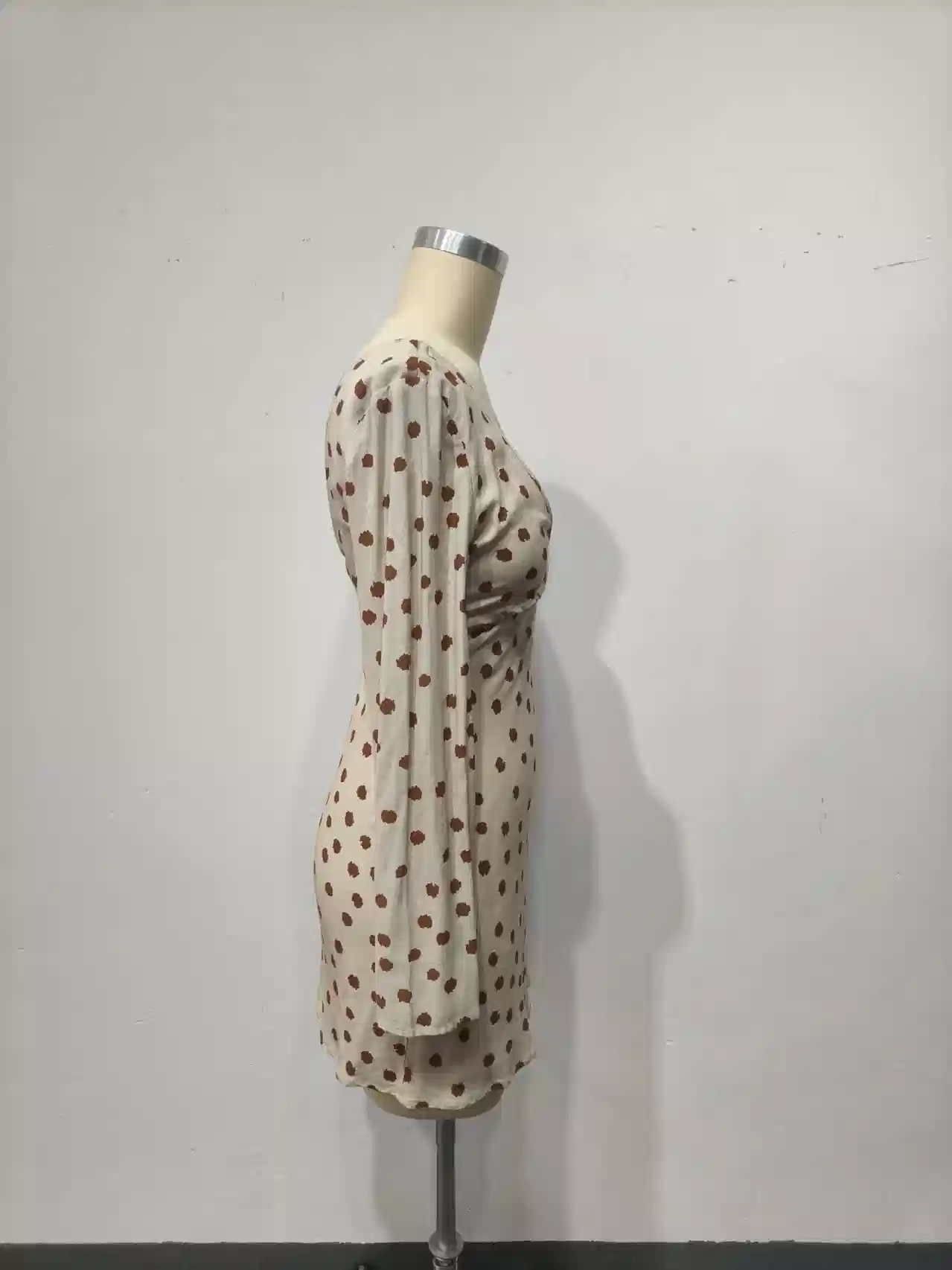 – Pattern: Timeless brown polka dots on a beige base create a classic yet trendy look. The pattern is evenly distributed, adding a fun and lively element to the dress.