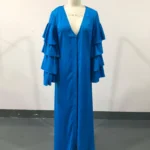 Crafted from satin fabric, this dress offers a luxuriously smooth and silky touch, draping beautifully to enhance the feminine silhouette. The standout features include dramatic tiered ruffle sleeves that add a playful yet chic flair, and a deep V – neckline for an alluring look. Perfect for making a statement at special occasions.